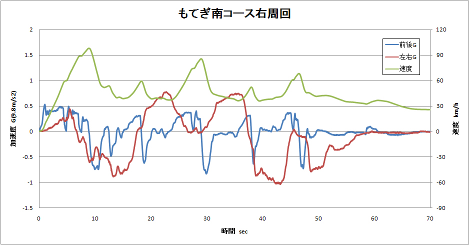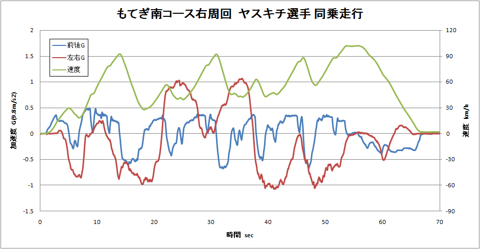 旋回Gを見てみると,私は左旋回が苦手のようです.ヤスキチ選手は,全コーナーでほぼ1Gの旋回Gを発生させています.