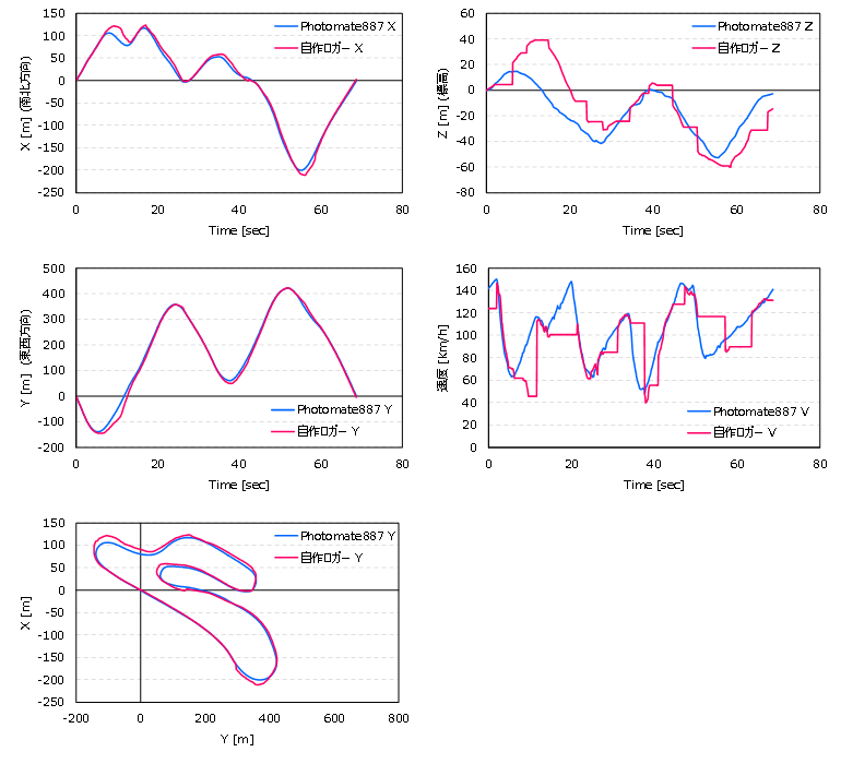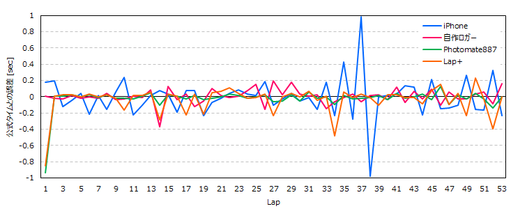 今回は,Photomate887のGPSデータについて,Lap+で出力したタイムと,私の方で使っているロジックで算出したタイムの比較も行っています(このロジックはiPhoneラップタイマーで使用しているものです).